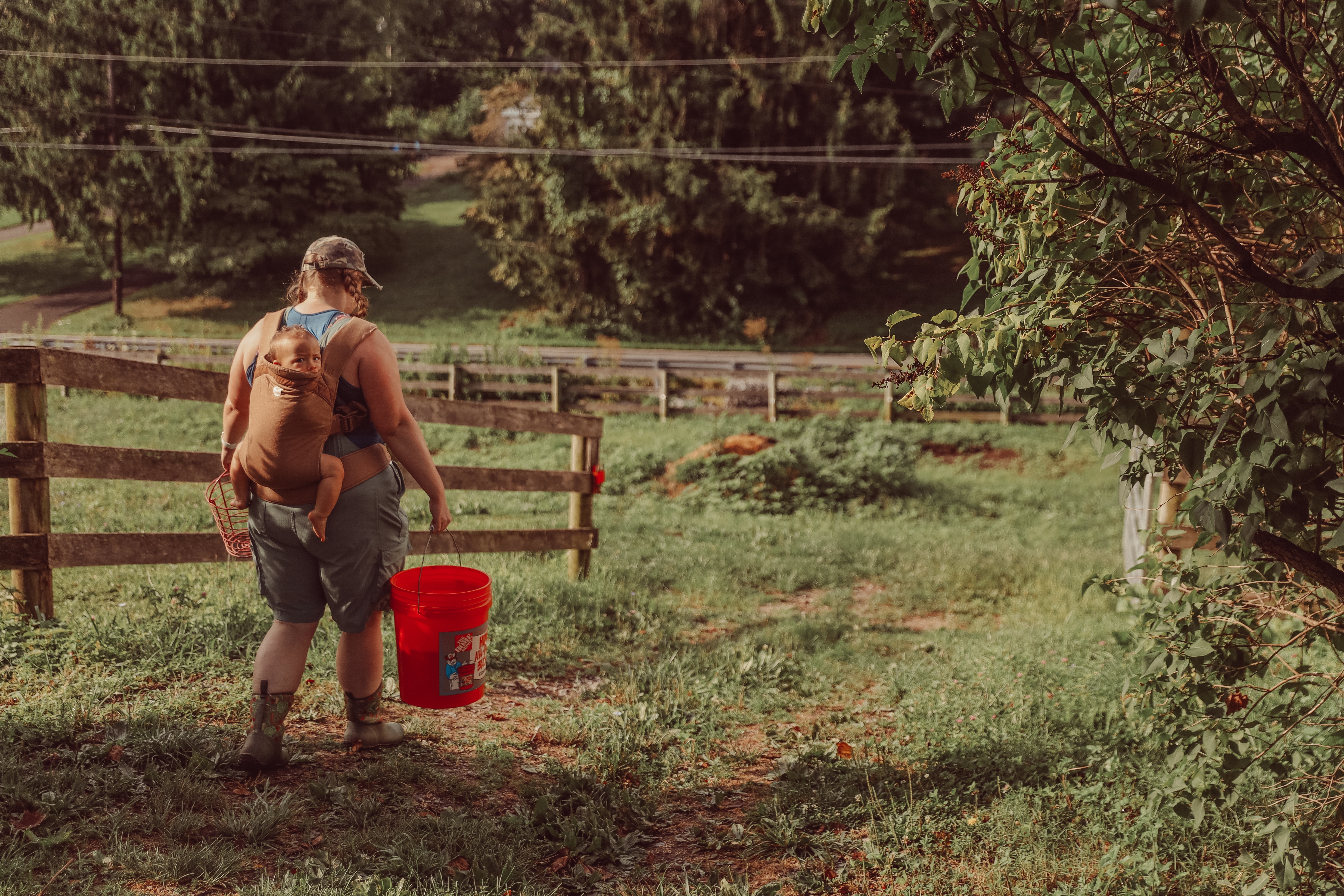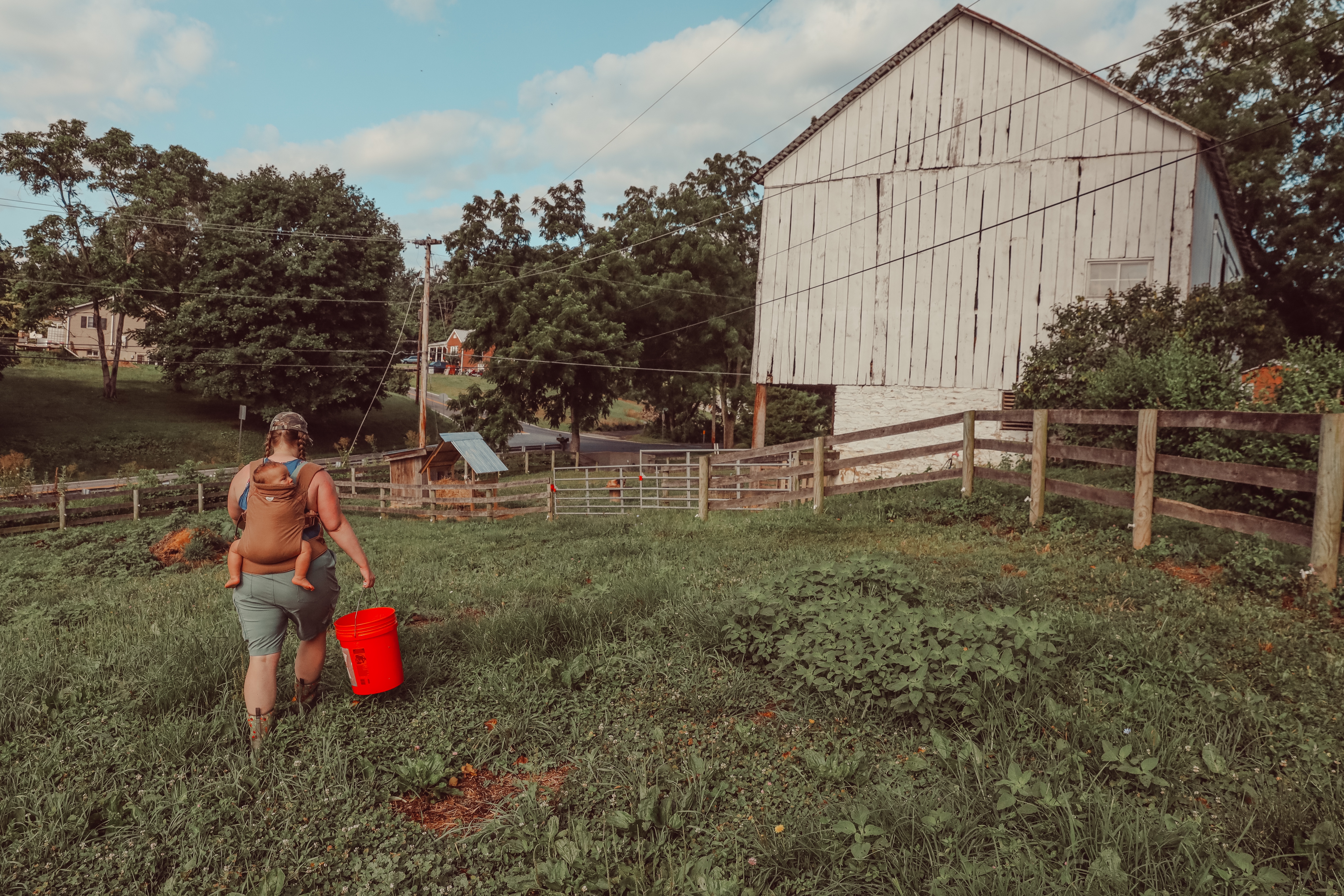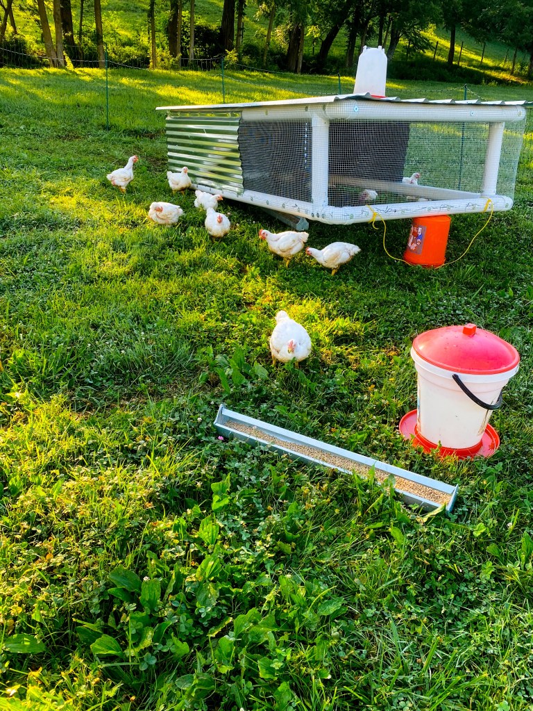 All of our meat birds are raised on pasture in portable pens, with the option to wander in an electrified enclosure. While they enjoy access to grass and whatever they can find on pasture, we offer free choice grain to supplement their diet.